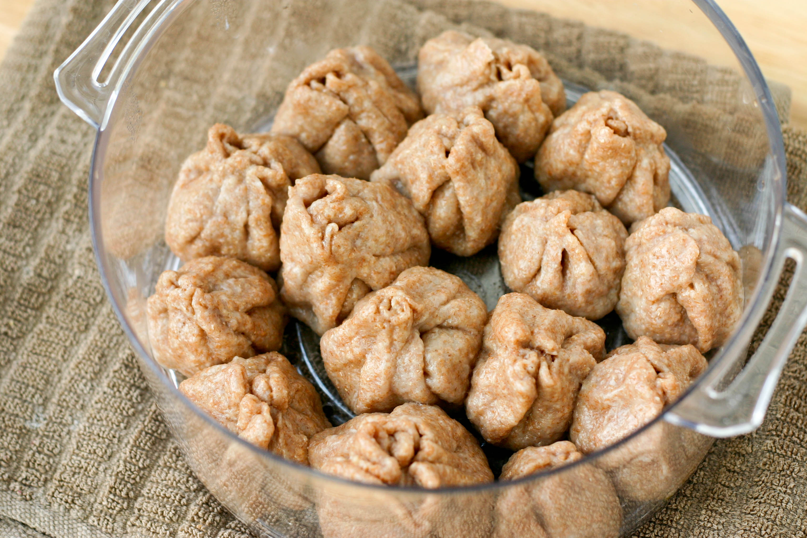 The first step is to make the dough to wrap the dumplings in, which simply involves kneading whole wheat flour with salt and water.