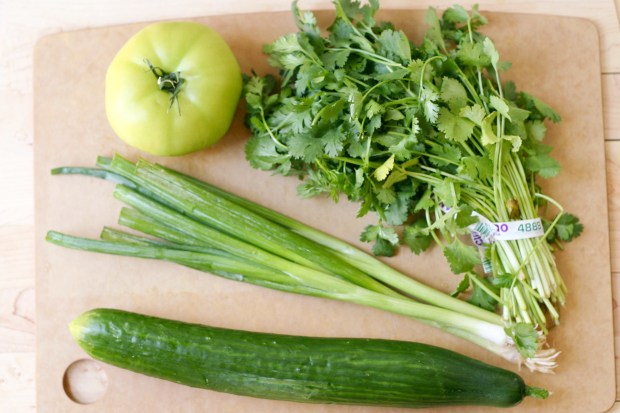 Then I turned to the greens. We had a green tomato left over from our North Carolina adventure, some cilantro, scallions and an English cucumber. I sliced and chopped each of these and tossed them in with the watermelon cubes.