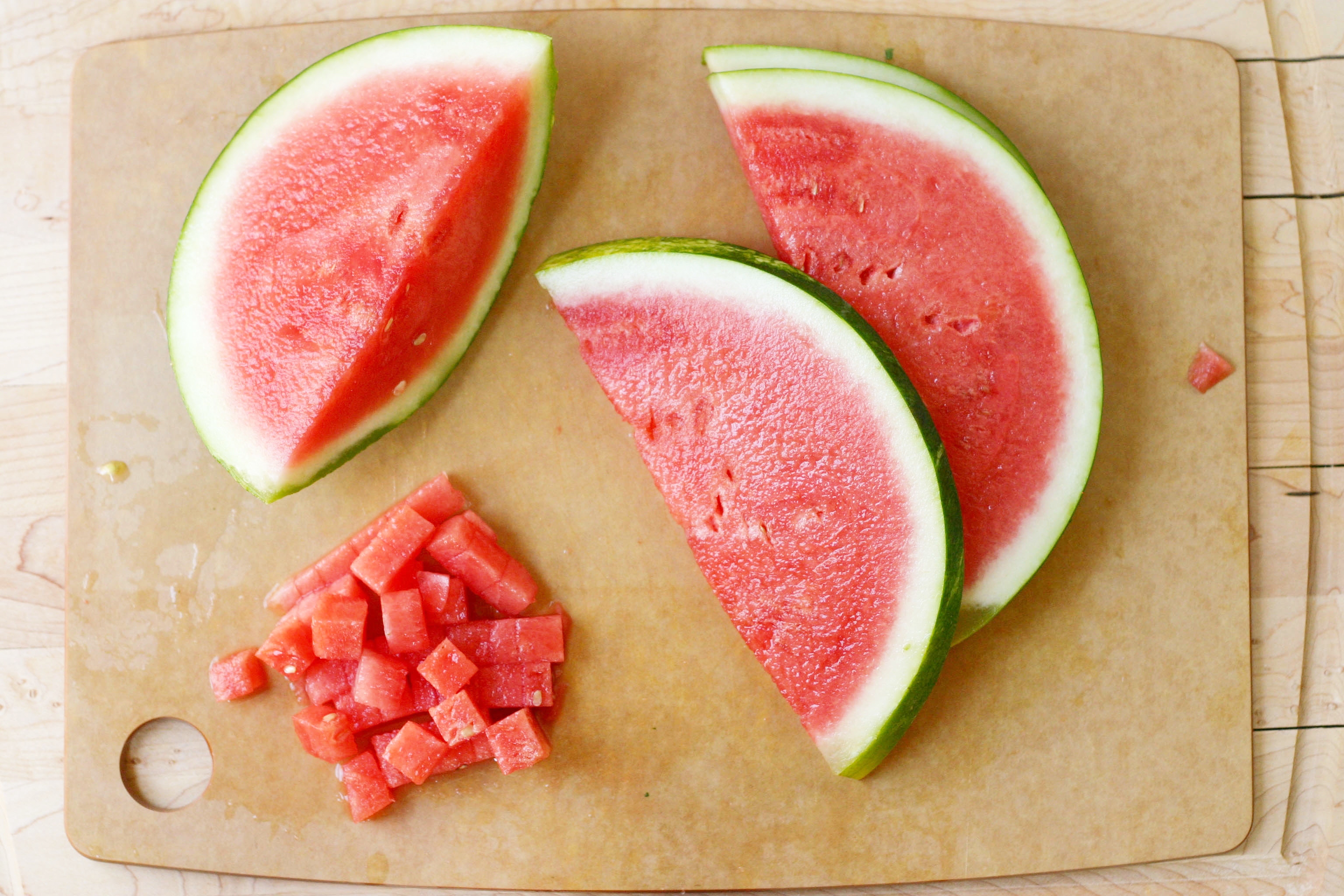 The recipe came about because I knew we needed a side for the sesame chicken. I wanted it to represent Asian flavors and I had a ton of produce sitting in the fridge that needed to be used. So I started with the biggest thing in the fridge – the watermelon. I cubed the melon from about four slices.