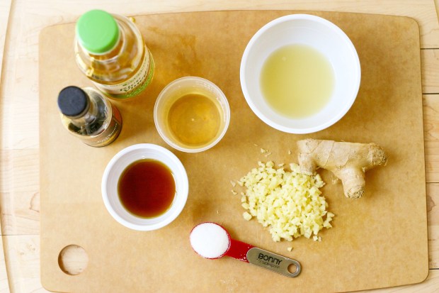 Finally I gathered some seasonings and dressings including fresh, minced ginger, rice wine vinegar, sesame oil, lime juice and a bit of sugar.