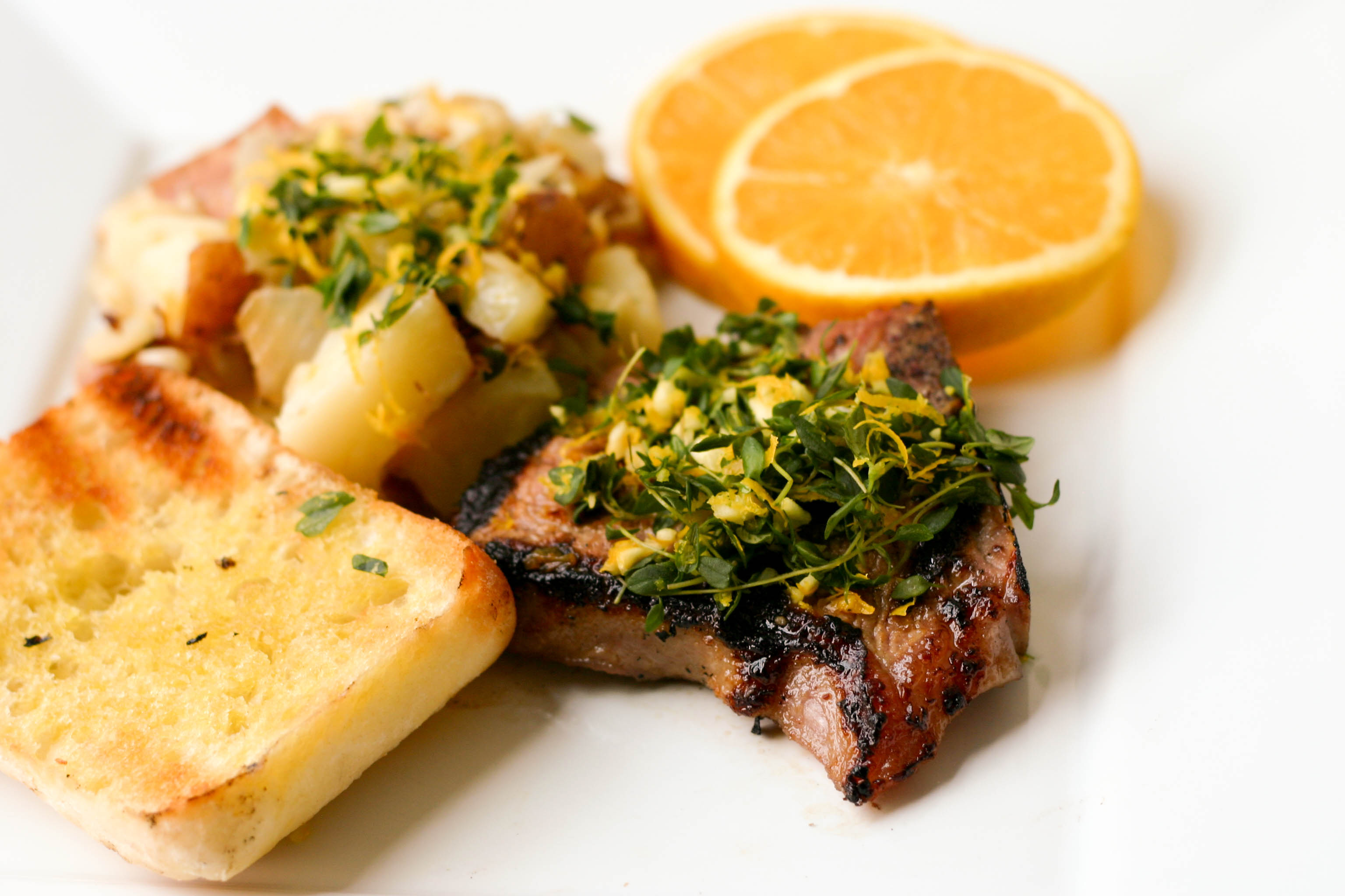 Once it was done, we served it with our grilled potatoes and then topped both with our orange thyme gremolata for our finished product.
