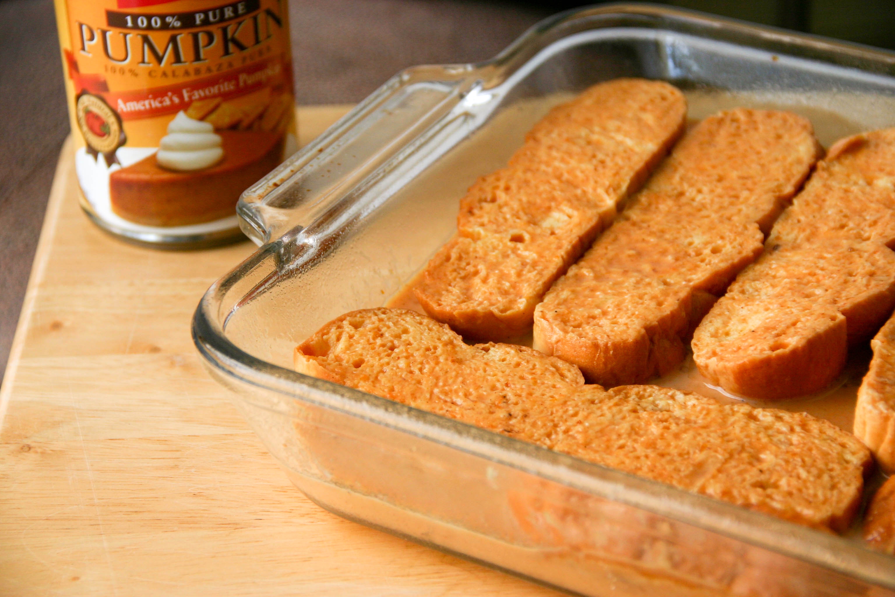 We started by soaking the slices of brioche in the batter – a mixture of milk, half and half, vanilla, pumpkin, eggs and spices.