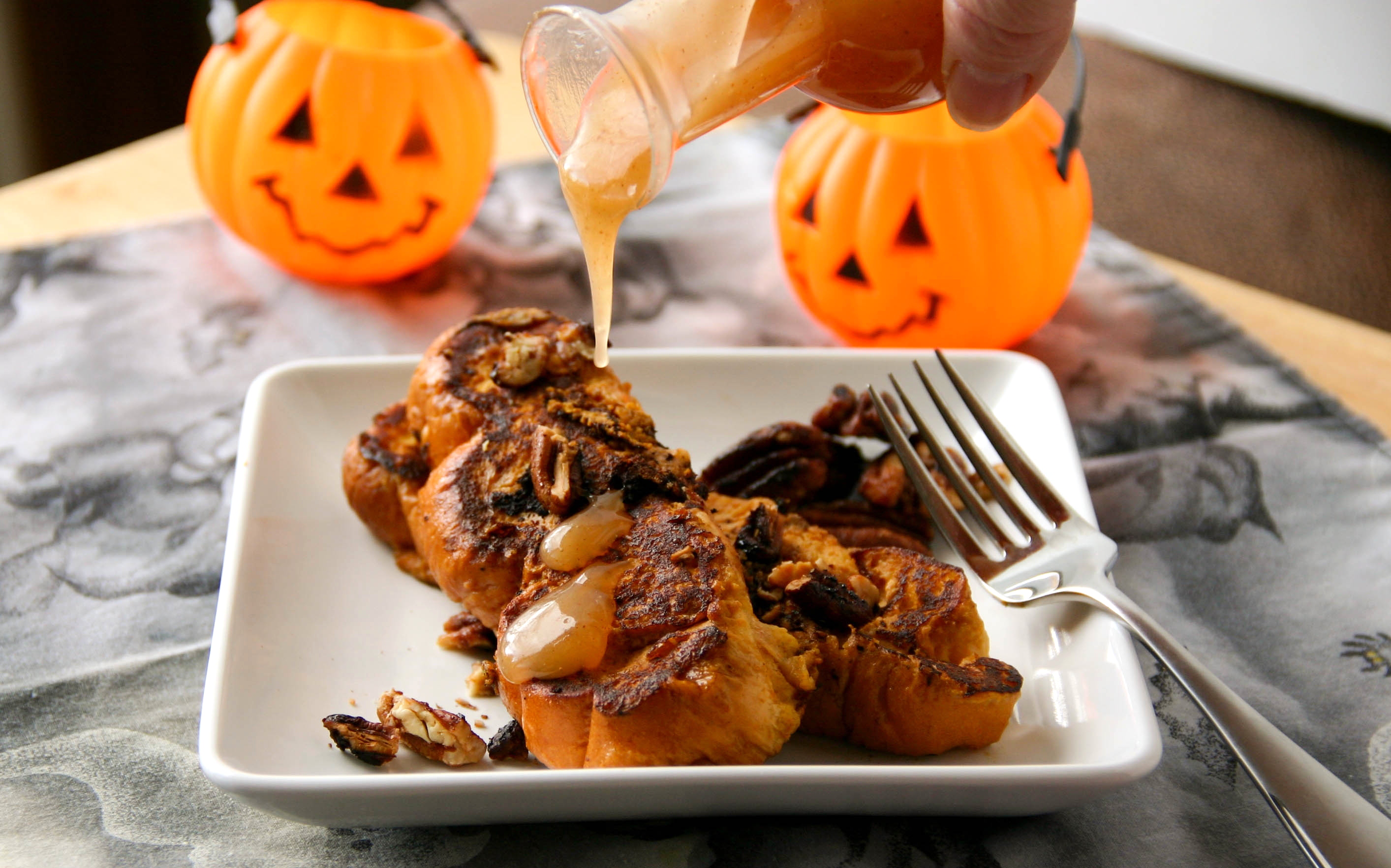 Oh Kristy, I think of all of the French toast recipes so far, this one may be my favourite… the combination of pumpkin and pecan sounds utterly delicious and it looks great too! Love the spooky ghost tablecloth and all the Halloween touches. I have no doubt that you’re in for a very fun evening with your cowgirl and werewolf… the energy is almost palpable over here too ;-). Have a great night guys!! :).