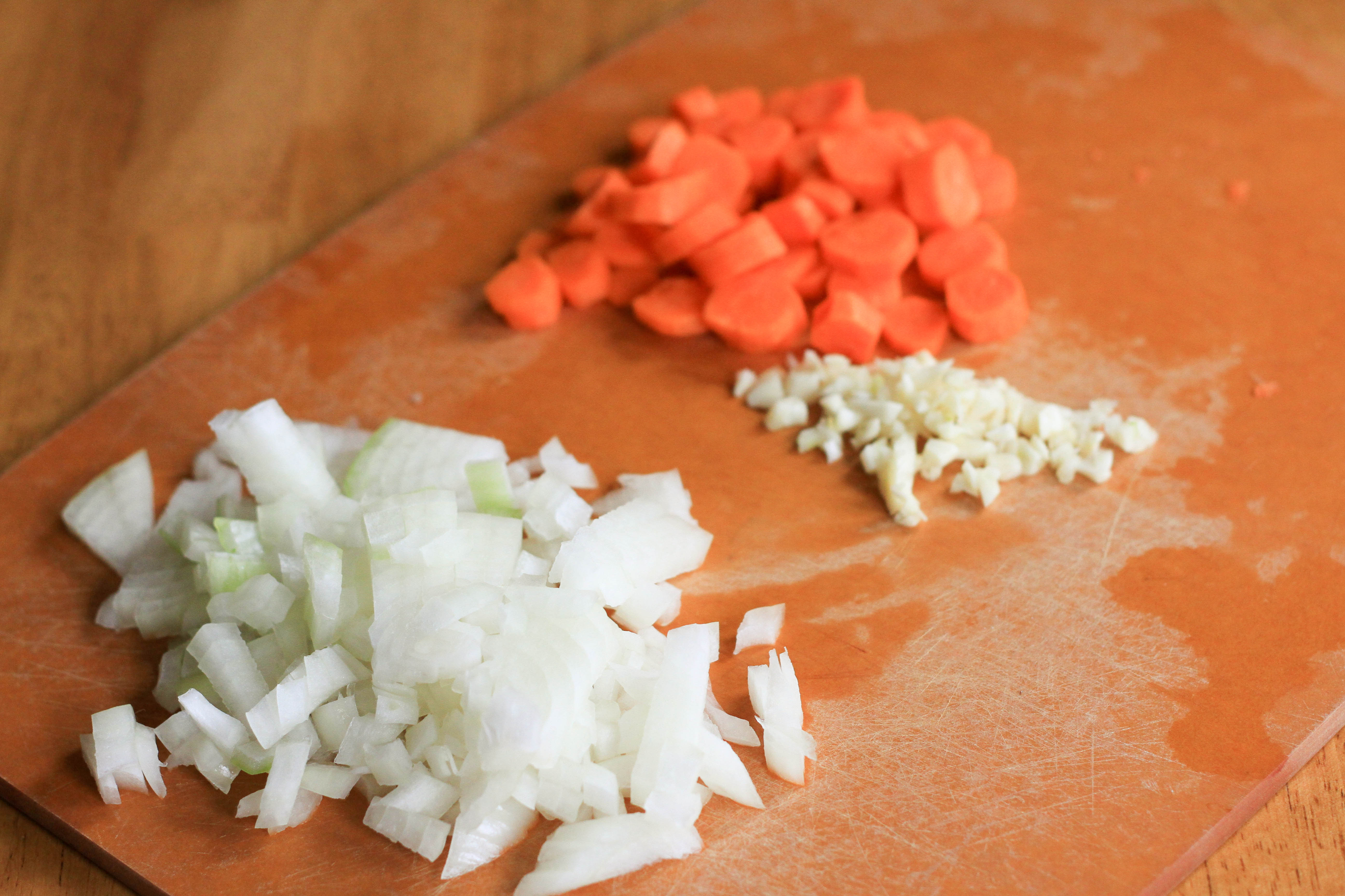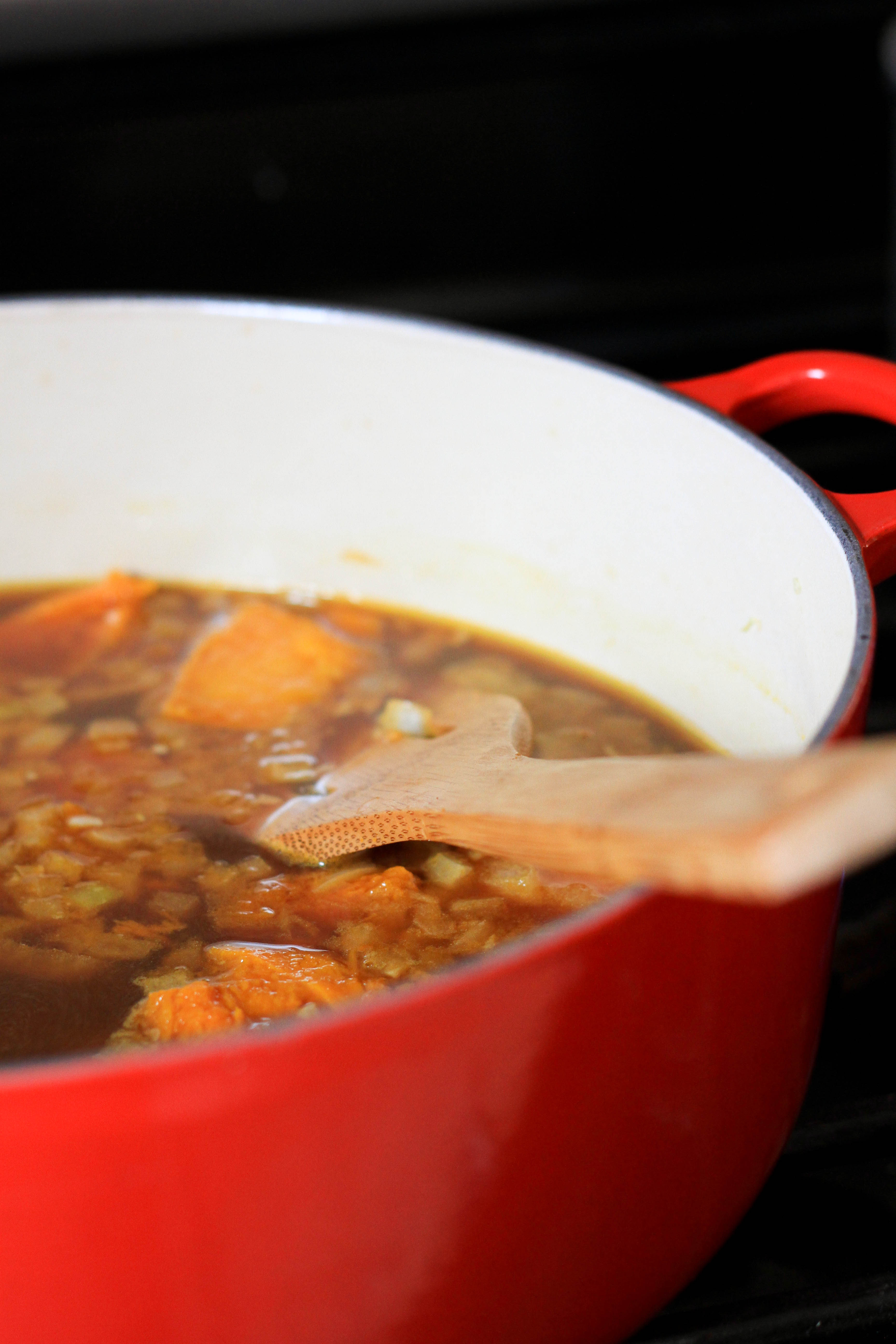 So the stew starts out simple enough – roast the squash with a bit of olive oil and sea salt. We’ve used an assortment of winter squash including buttercup and acorn, and they’ve all worked well. We also typically roast the squash on the weekend, store it and whip the stew up on a weeknight. When you’re ready to make the stew, heat the olive oil, drop in some garlic (Sally – you can omit the garlic), carrots and diced onion, and saute until the veggies are tender.