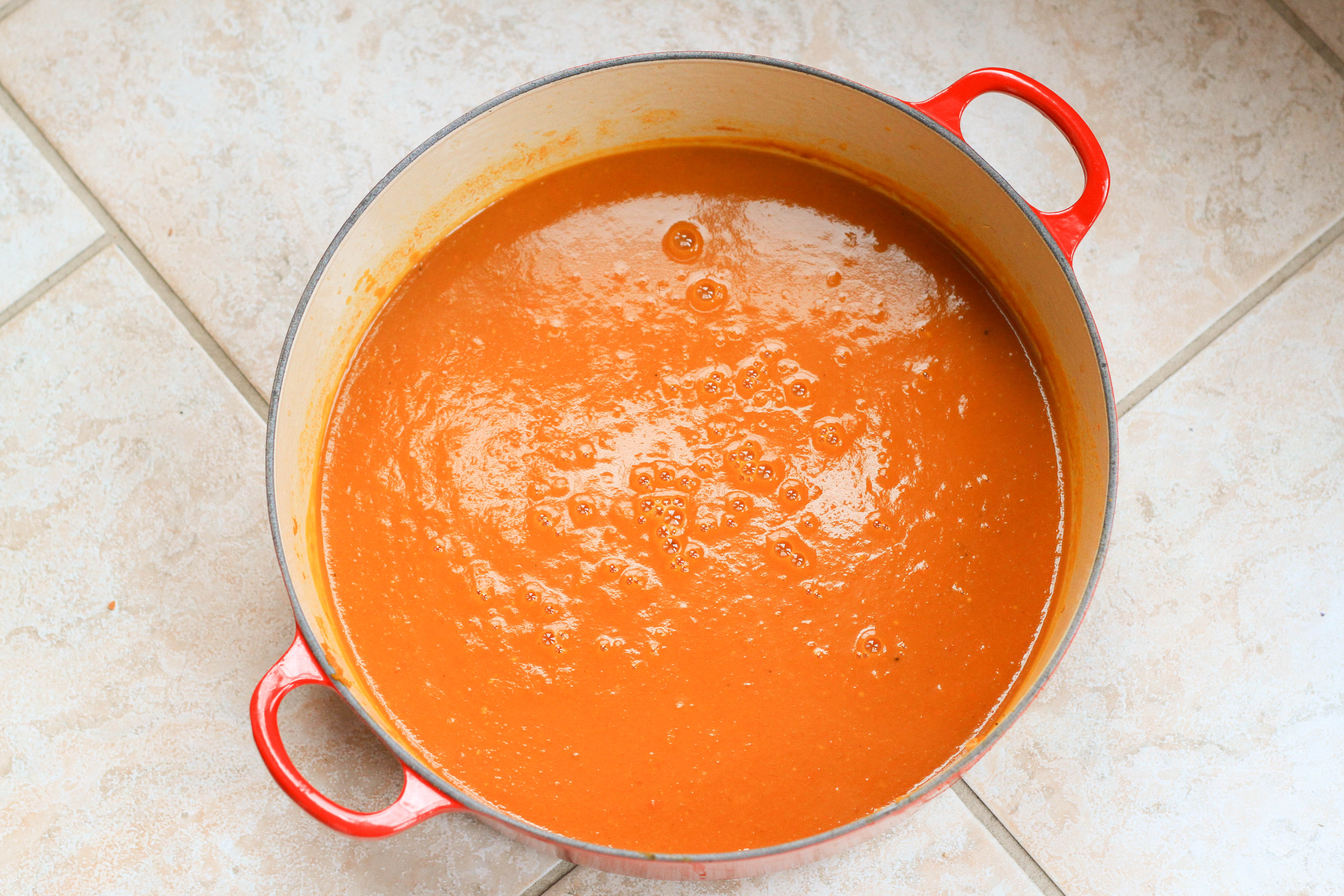 Next we add a bit of veggie stock and water, the roasted squash, a tomato and a boat load of seasonings including salt, pepper, red pepper, turmeric, oregano and cumin. We bring the stew to a boil, then reduce to a simmer and cook for about 20 minutes. Next we transfer batches of the stew to the blender to puree and then return it to the pot.