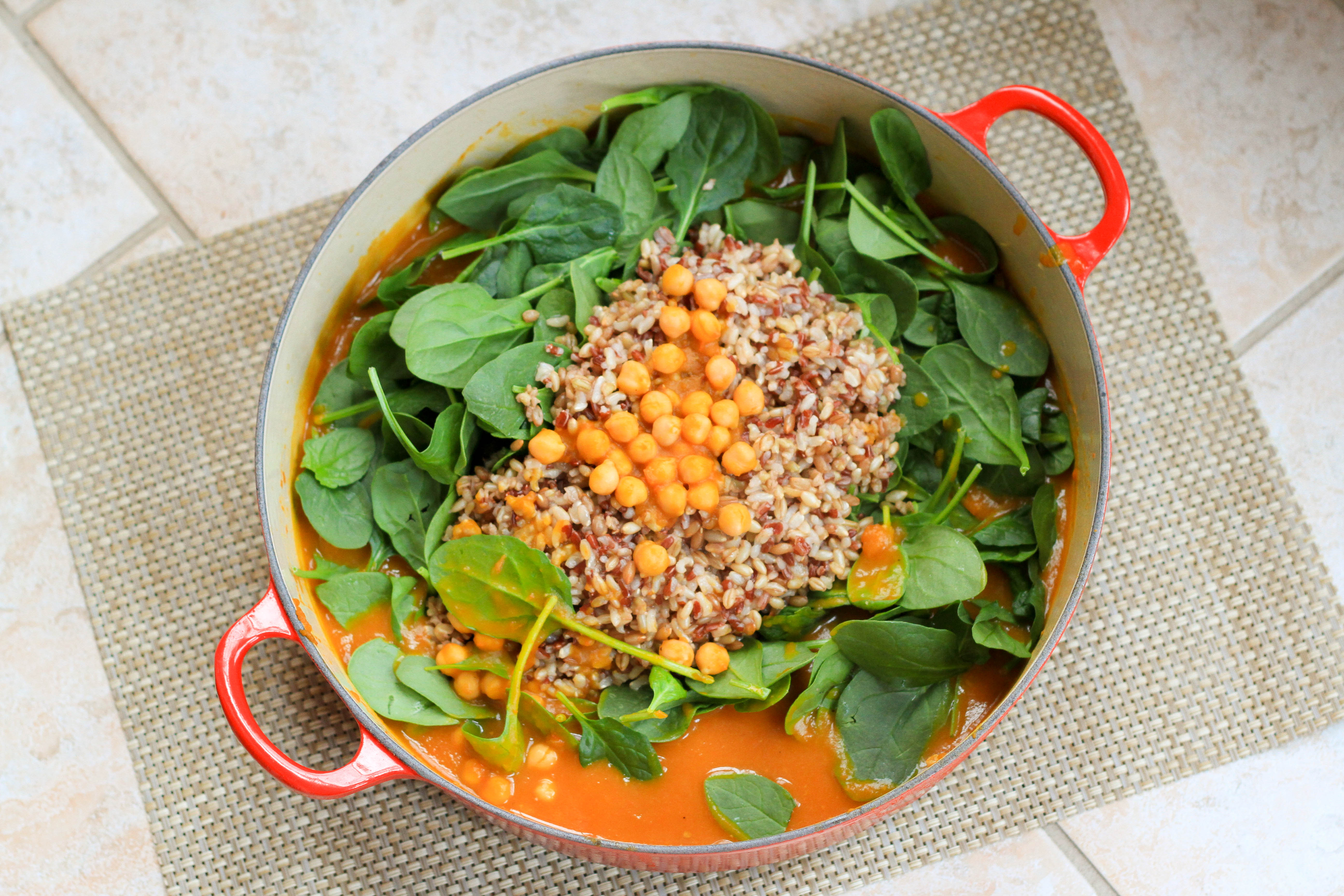 Finally we add cooked wild rice, fresh spinach and chickpeas to the pot, mix it together and cook it for another 10 minutes, or until the spinach wilts and the beans are heated through.