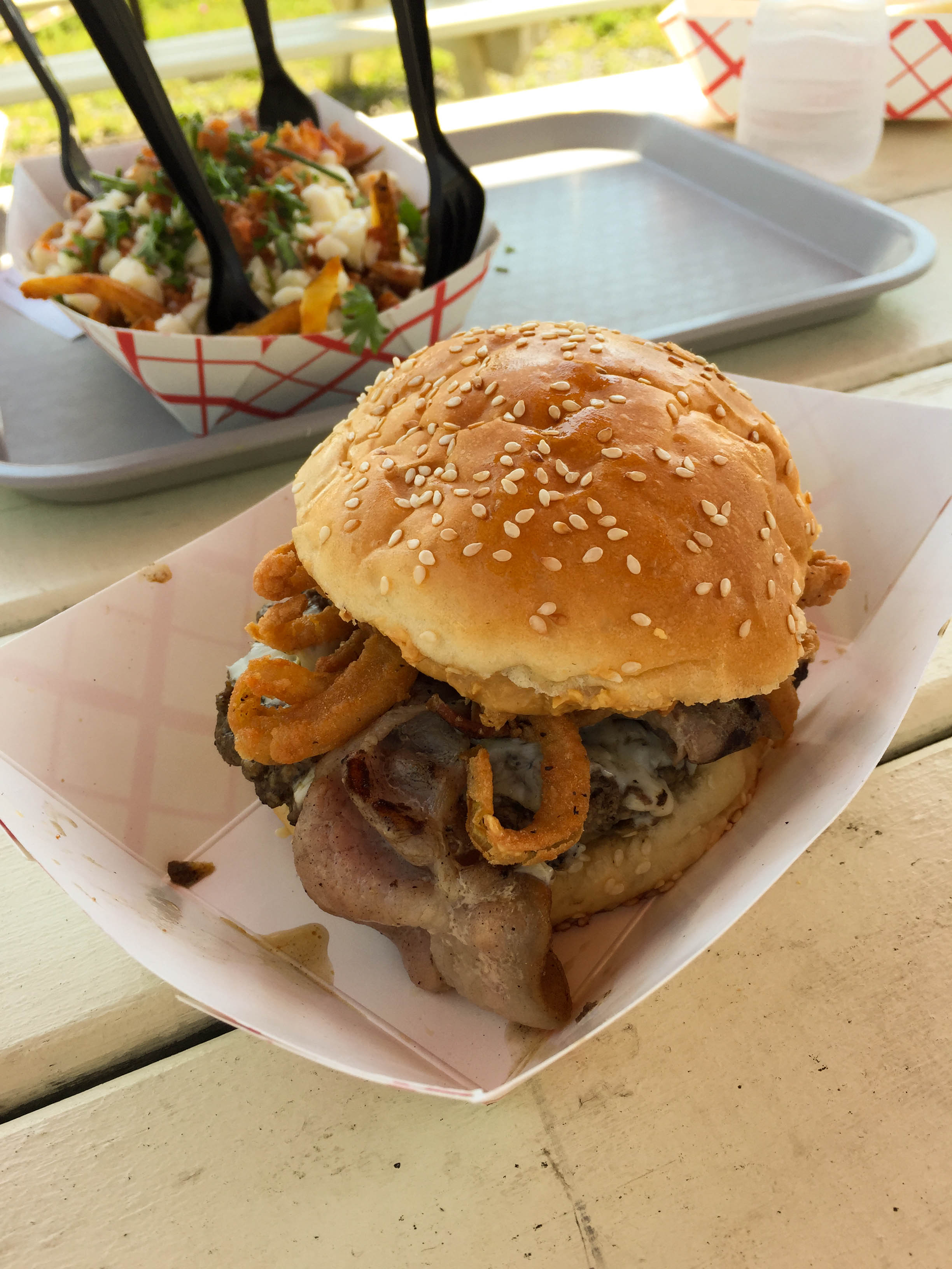 We were immediately surprised upon entering. The small town food stand gave way to a unique blend of urban gastro pub and summer camp eatery (the kind of place tweens and teens find those first summer romances after a swim at the lake). There was a surprising amount of seating throughout at four-person booths and larger more communal benches. The tables were each set with a metal napkin dispenser and plastic bottled condiments. (An observant person might notice the bottle of Sriracha on the tables too – our first clue that this place might be more than we expected.)