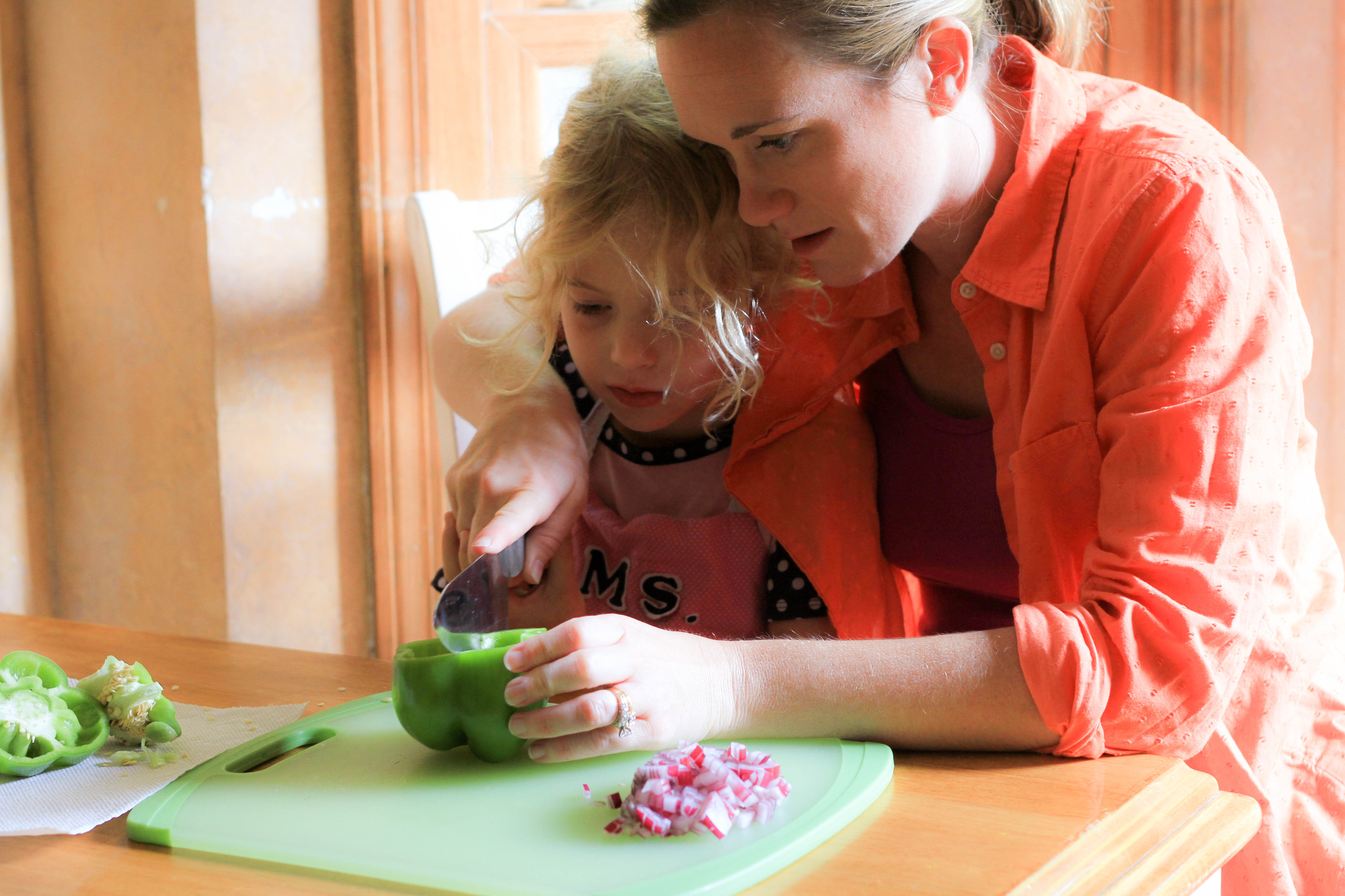 Miss A and I made our frittata last week, and like the mealtimes back in Colorado, we spent a morning free of distraction. Miss A helped me chop the green pepper and onion, even slicing a few strips on her own.