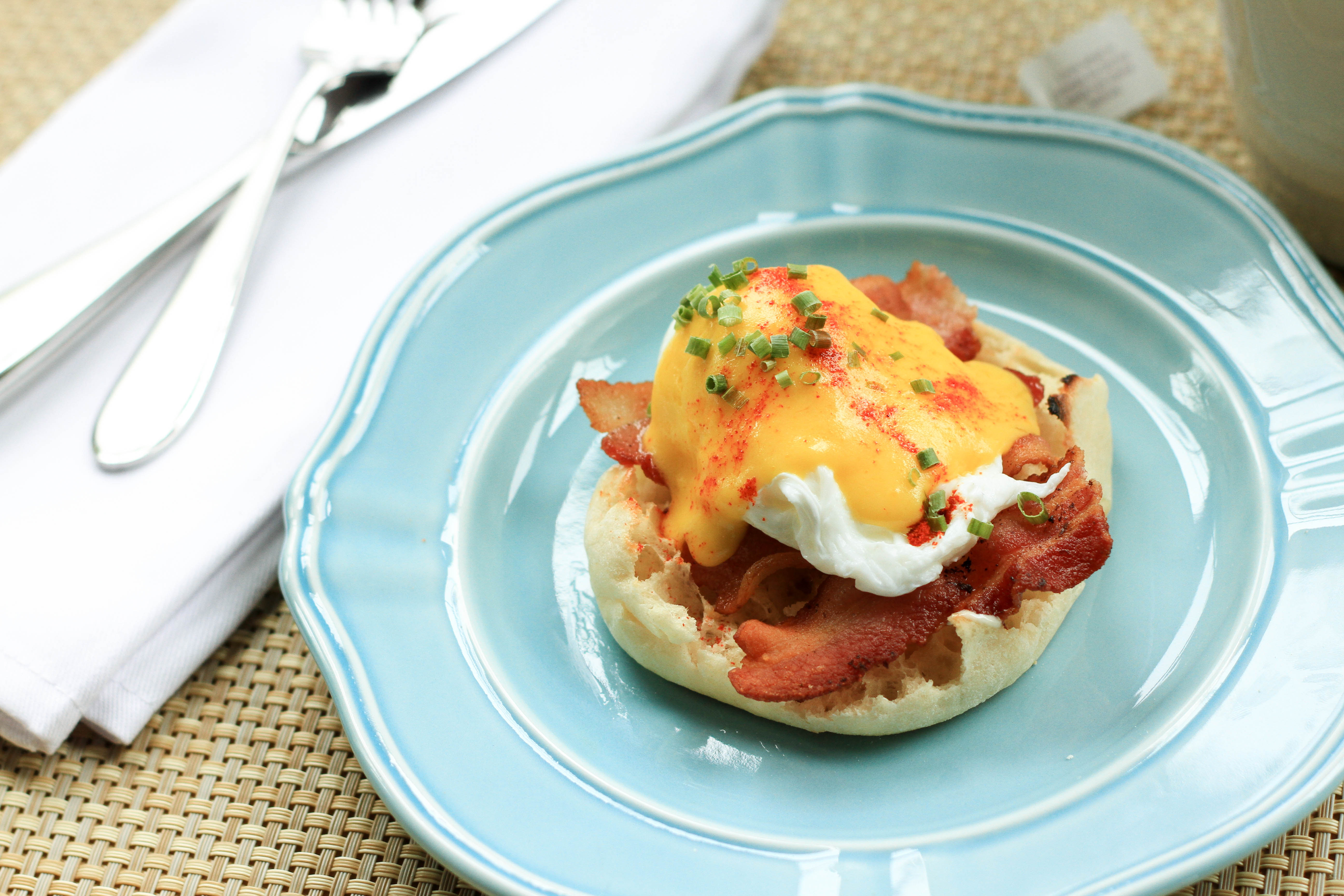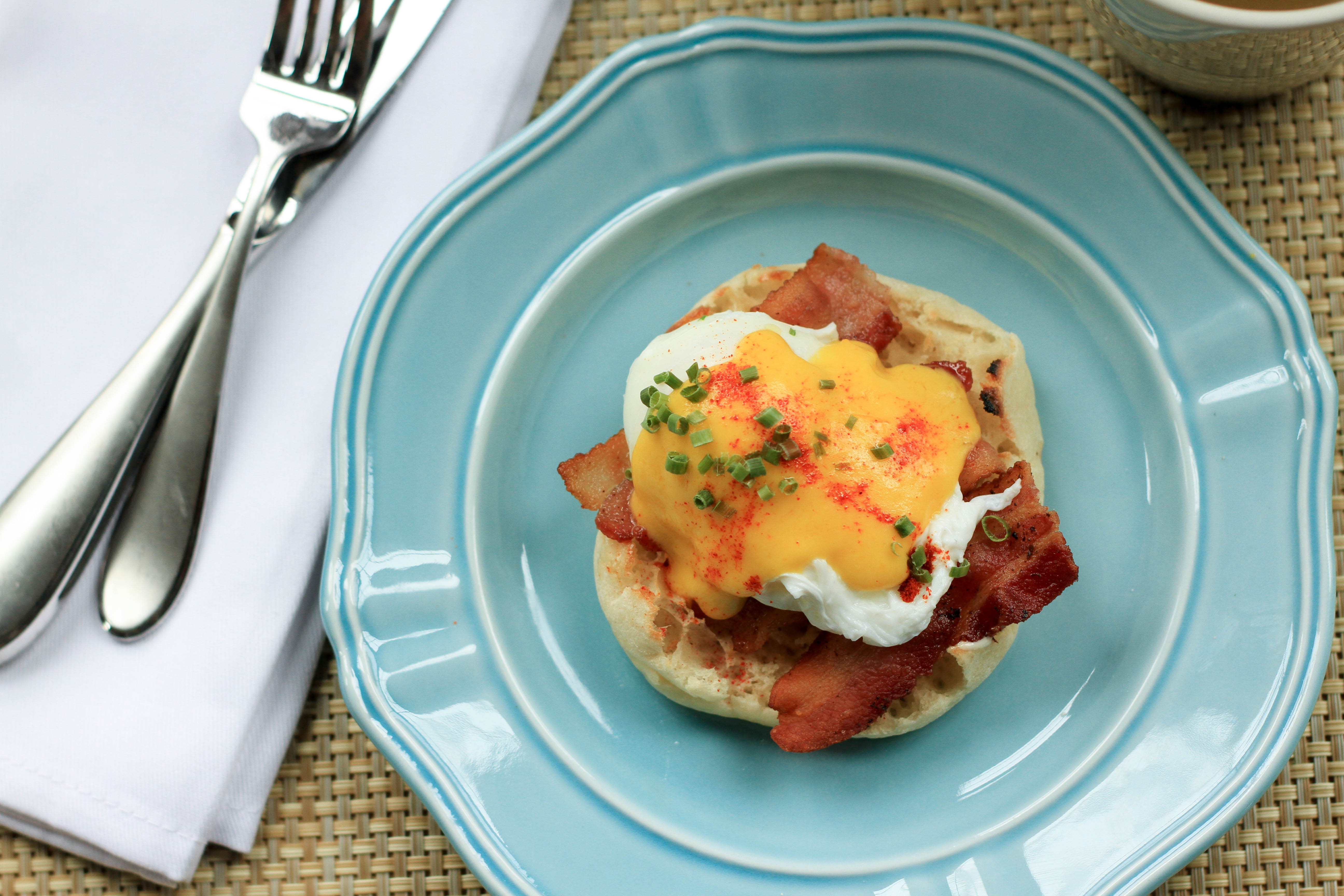 Miss C was gracious enough to send the eggs Miss A collected home with us and we knew right away how to put them to good use. With our trip to Canada and New York around the corner (the one we just returned from – is it just me or is time flying this summer!), we figured it was time for a stateside recipe. Did you know that according to one account Eggs Benedict originated in New York City at the Waldorf Hotel in 1894? And did you know that Eggs Benedict is best when made with fresh eggs? Well, we can now attest to that!