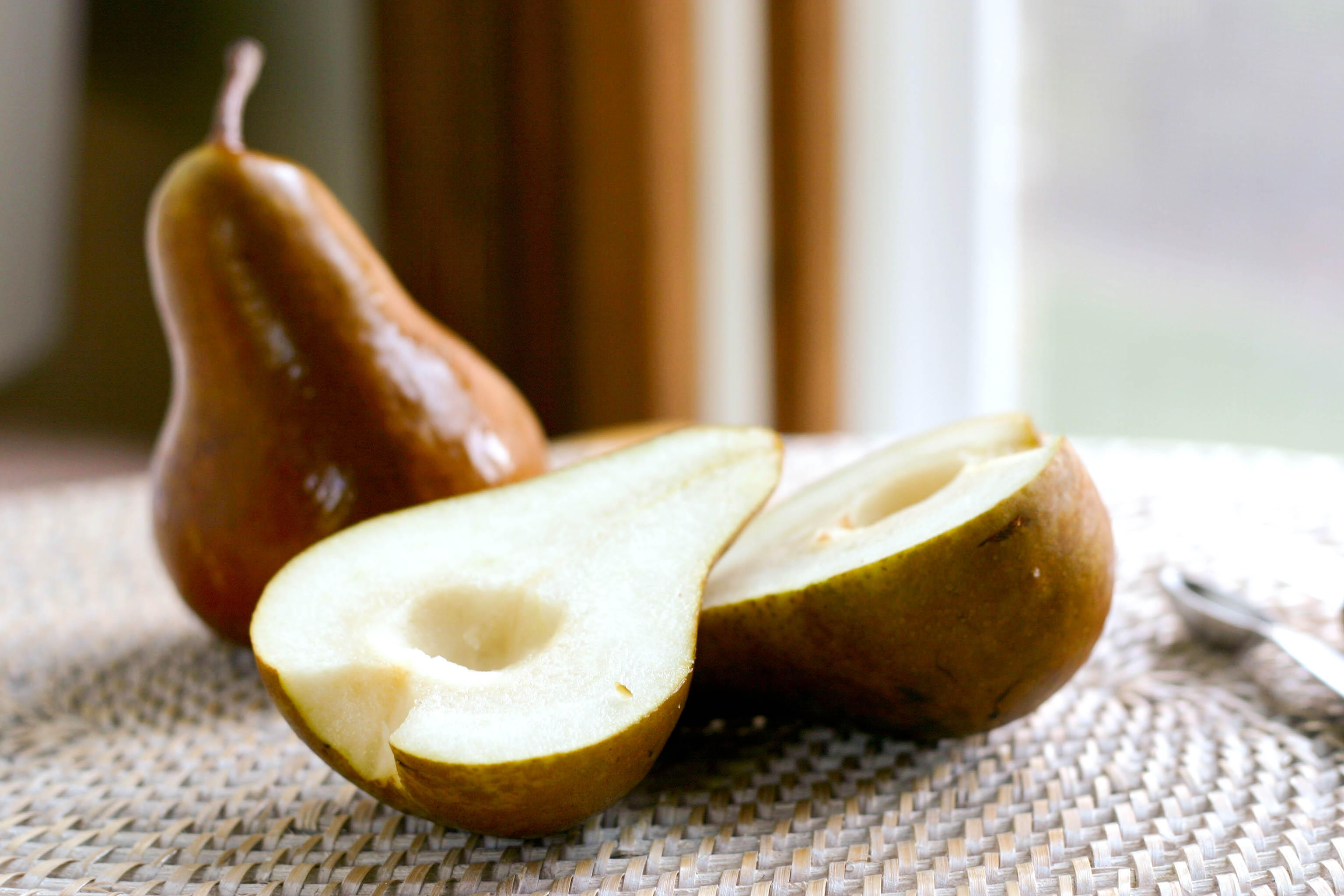Start with some Bosc pears, slice them in half, scoop out the core and remove the stem.