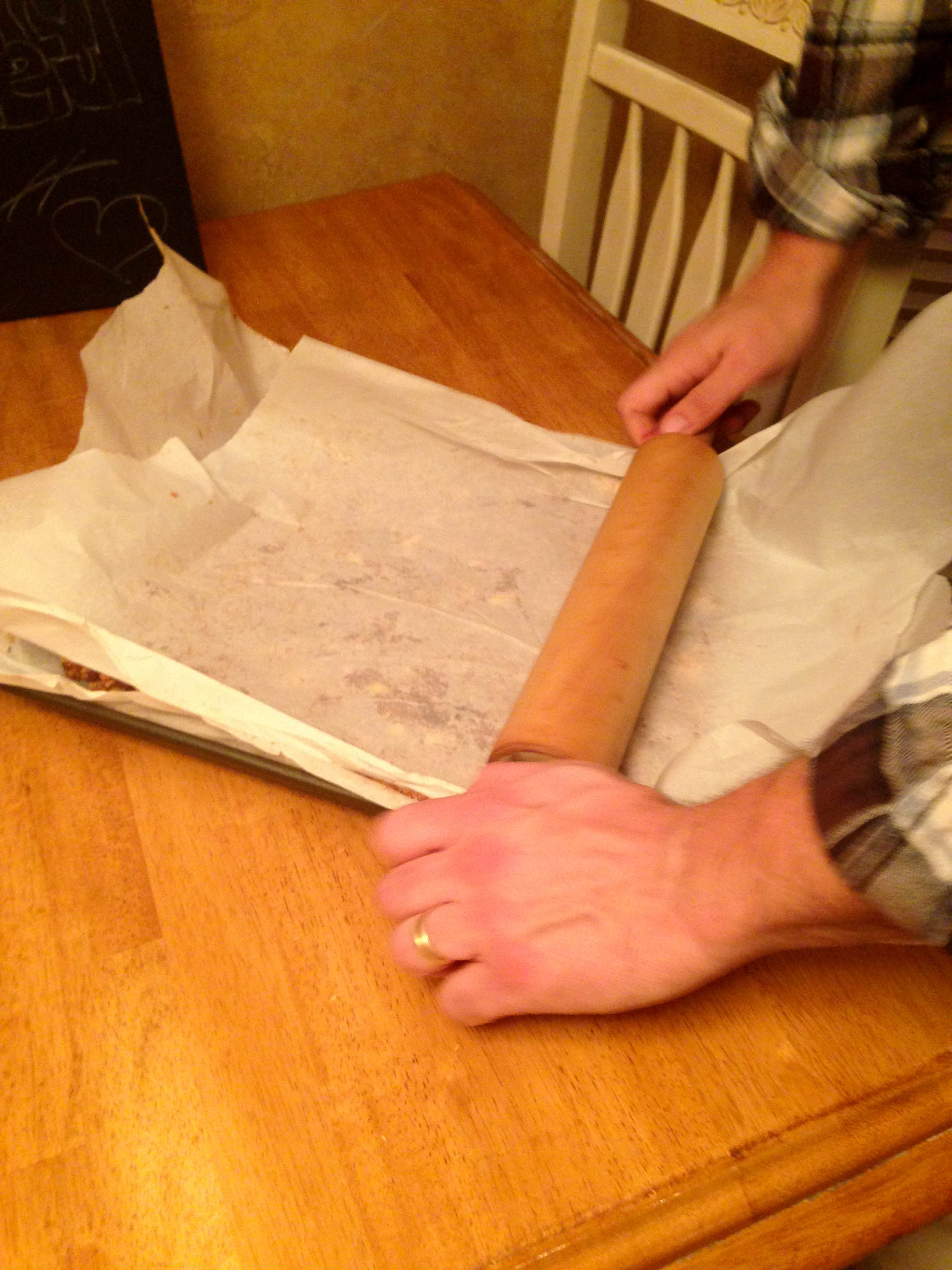 and rolling out something under some parchment paper.