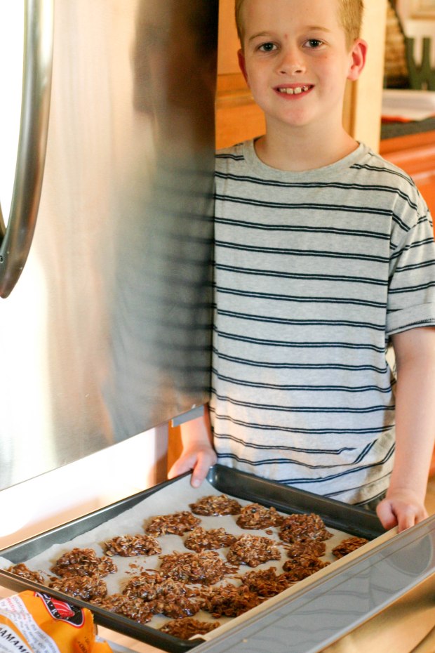 So that’s what team Cleavers opted to do. We subbed the quinoa for oatmeal, the vanilla for Grand Marnier and added bits of dried, chopped mango in our regular recipe. The result was interesting. It certainly had the flavor of no bake cookies, but not quite the texture. Mr. N and Miss A both loved them and gave them a 4 spoon rating – the same as the regular recipe. Mike and I gave them 3 spoons each; although in retrospect they were more like 2 spoons. I didn’t eat them again.