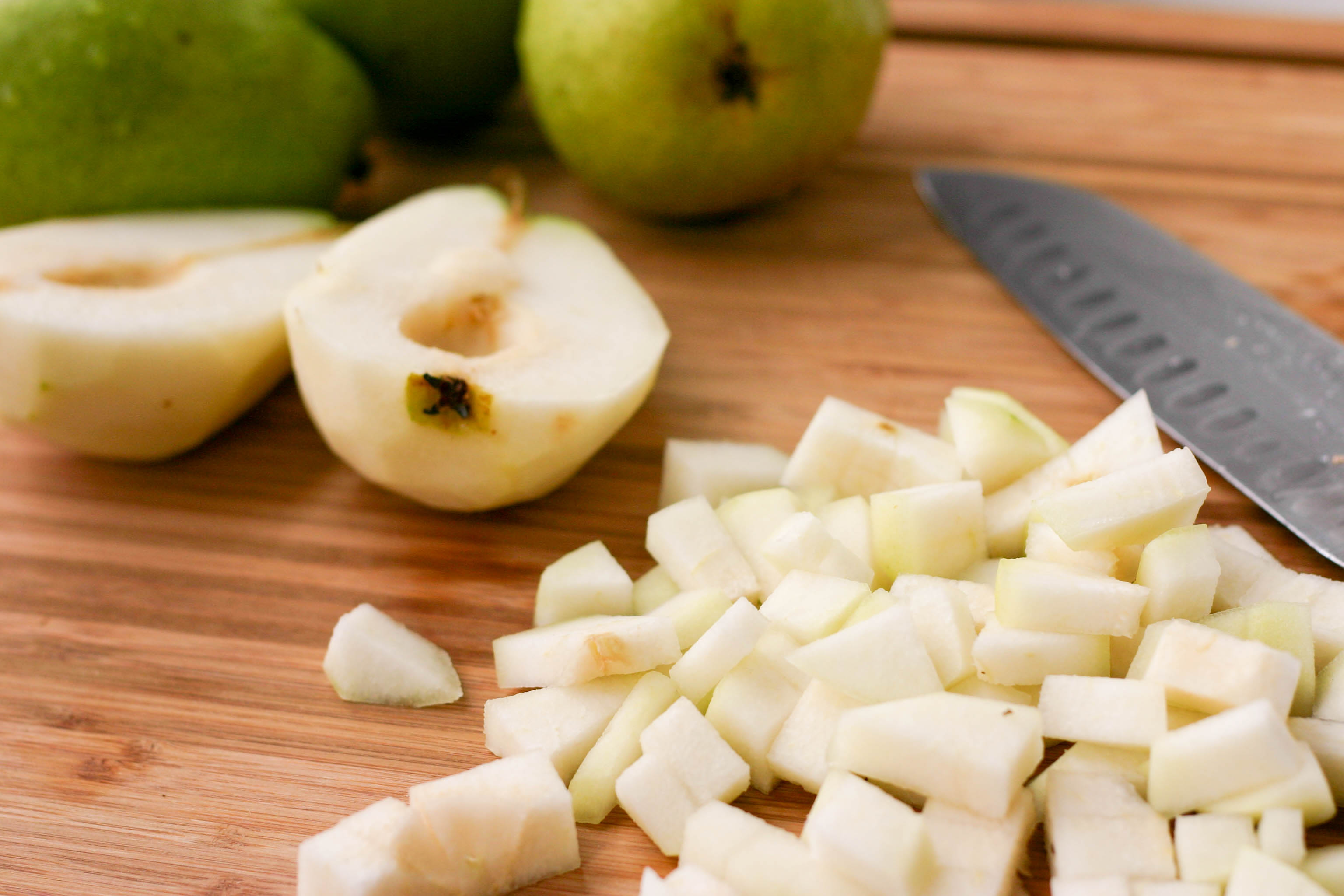 We began our cobbler by chopping six pears. We peeled them this time.