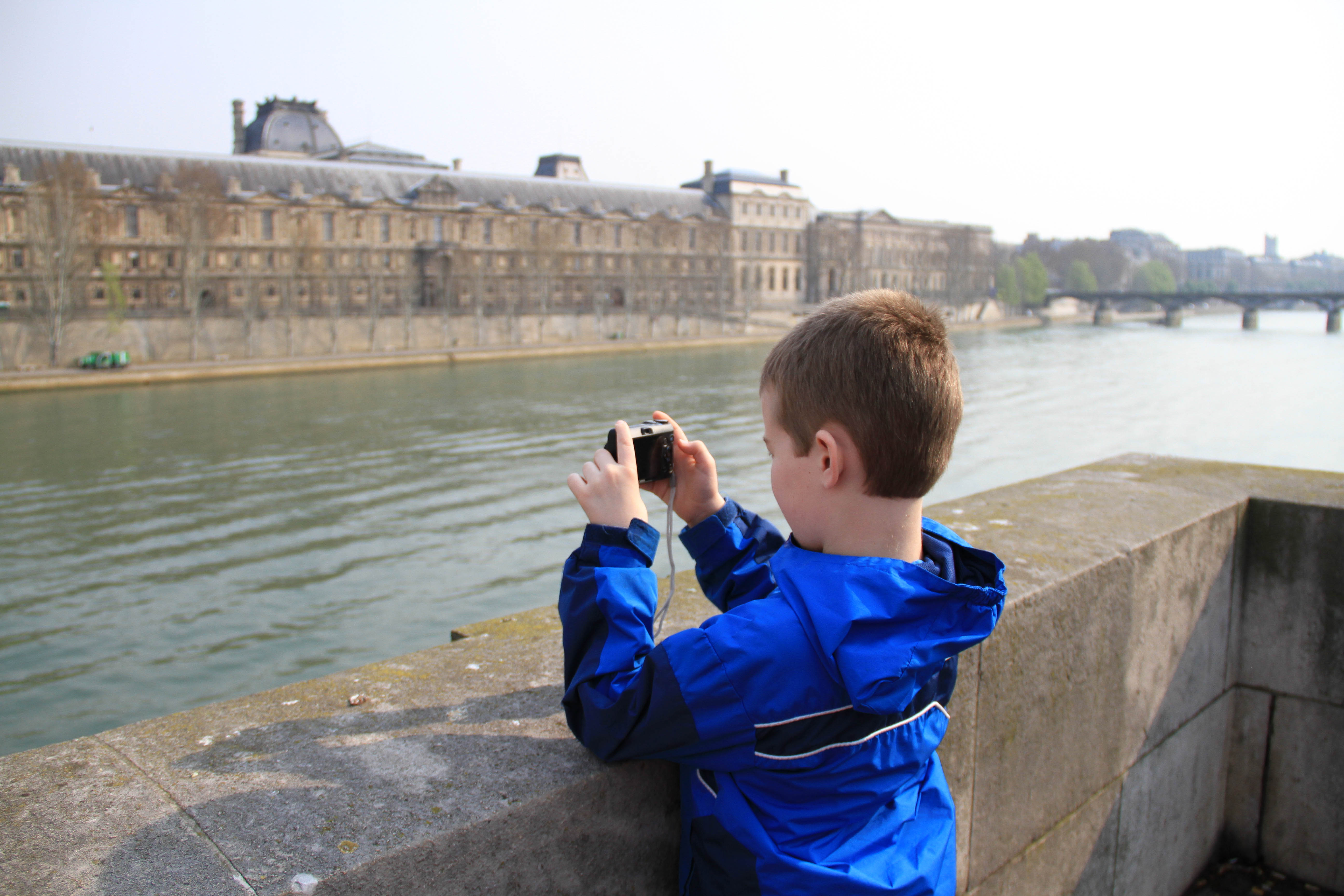 The kids did a fabulous job on the overnight flight. They managed to catch about four hours of sleep on the plane, an hour in the taxi and then stayed bright and happy for a 15-hour day of sight-seeing and walking about. Since our flight arrived early in the morning and our apartment wasn’t available until the afternoon, to help with our time change adjustment, we planned a day outdoors and moving. We must have walked four or five miles that day. (Of course, drinking cafe au lait and snacking along the way!)